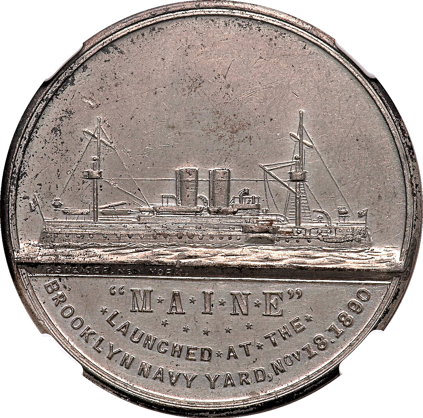 below microscopic R. Sneider. New York.; below M*A*I*N*E / 5 stars in row / * Launched * at * the * / Brooklyn Navy Yard, Nov. 18. 1890