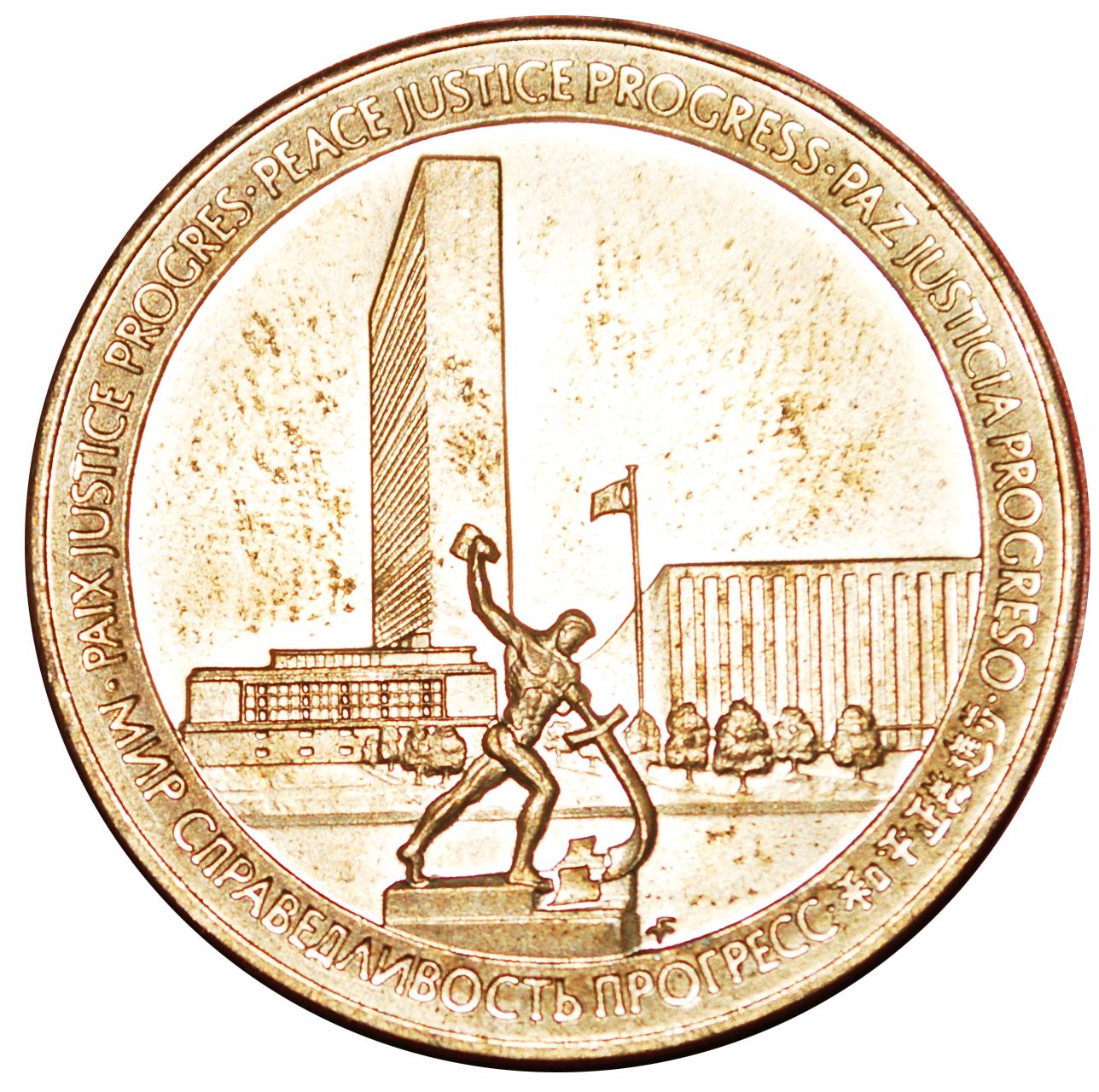 Описание: Будівля Секретаріату ООН із скульптурою, що символізує робітника, та написом «МИР, СПРАВЕДЛИВІСТЬ, ПРОГРЕС» французькою, англійською, іспанською, російською та китайською (традиційним написанням) мовами вздовж краю, знак монетного двору праворуч від пам'ятника.