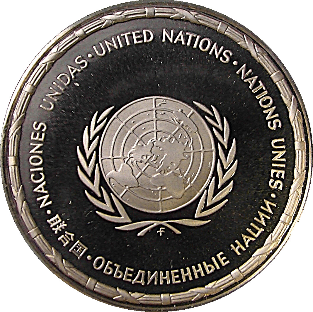 Описание: Логотип Організації Об'єднаних Націй у центрі над вінком з написом «Організація Об'єднаних Націй» 5 мовами (іспанською, англійською, французькою, китайською та російською) по периметру монети.