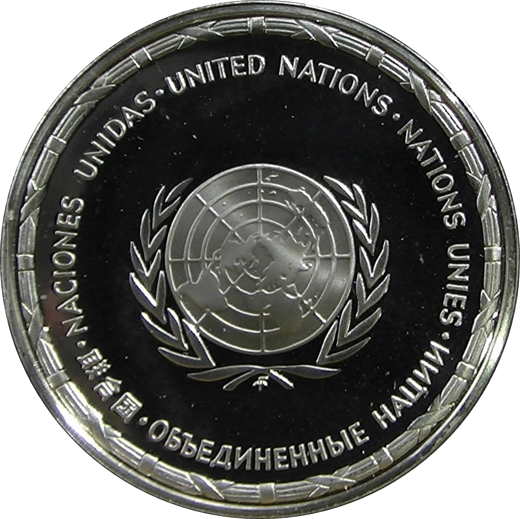 Описание: Логотип Організації Об'єднаних Націй у центрі над вінком з написом «Організація Об'єднаних Націй» 5 мовами (іспанською, англійською, французькою, китайською та російською) по периметру монети.