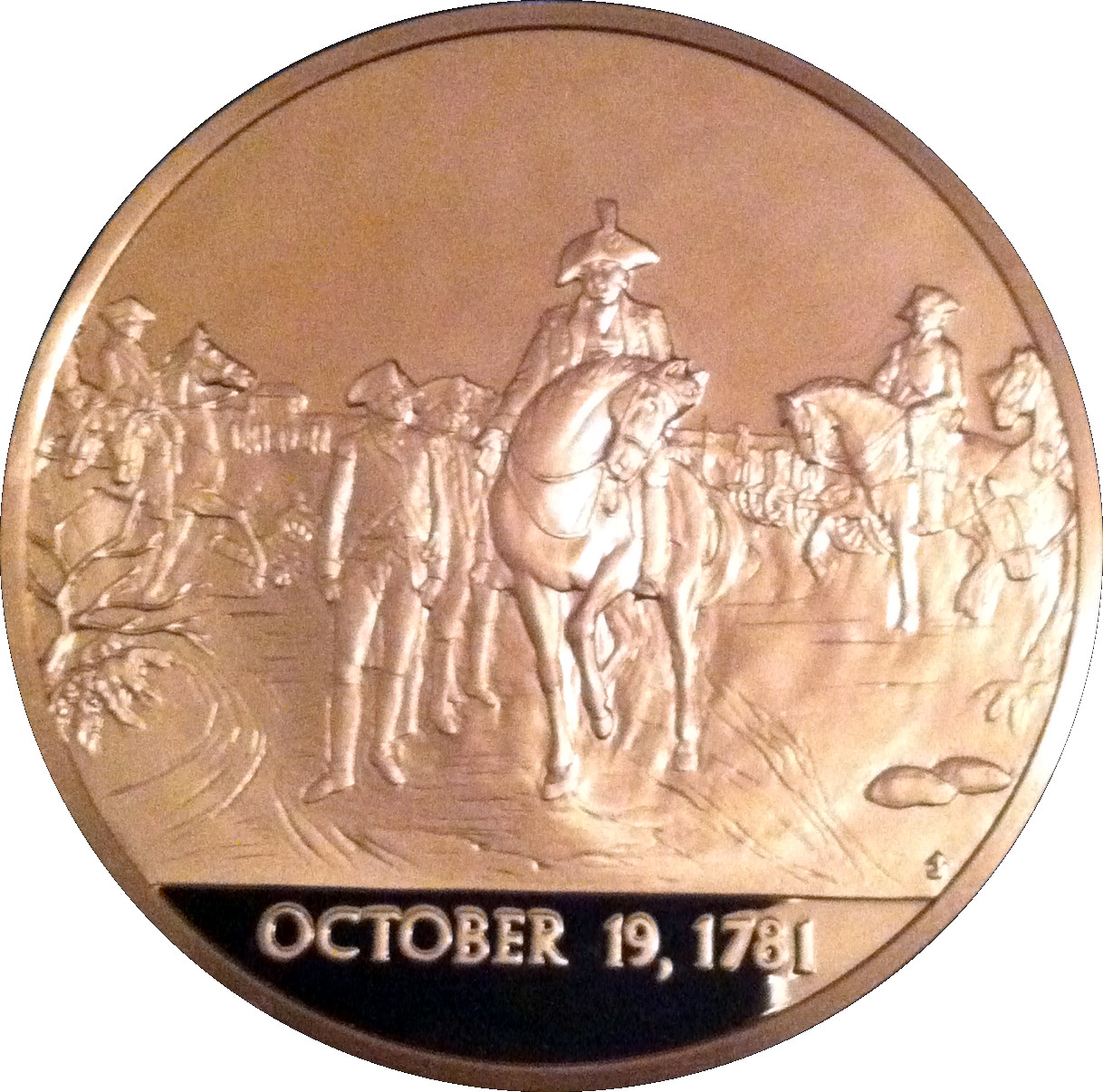 Описание: Джордж Вашингтон на коні оглядає свої війська в Йорктауні; праворуч і ліворуч видно піхотинців і кіннотників. На задньому плані праворуч — ряд гармат; ліворуч, далеко на задньому плані — великий будинок, на середньому плані — група солдатів.