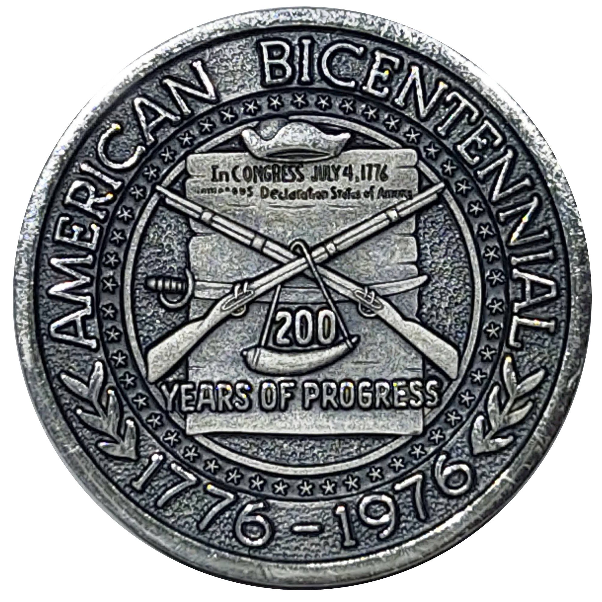 Описание: «AMERICAN BICENTENNIAL» (Двохсотріччя Америки) та «1776-1976» навколо зовнішнього кола, потім коло з 50 зірками, з графічним зображенням Декларації в центрі: «У КОНГРЕСІ 4 ЛИПНЯ 1776 РОКУ» «... Декларація Держав А...»; капелюх над декларацією; схрещені рушниці, меч і порохівниця з «200» і «YEARS OF PROGRESS» (200 років прогресу) в нижній частині посередині.