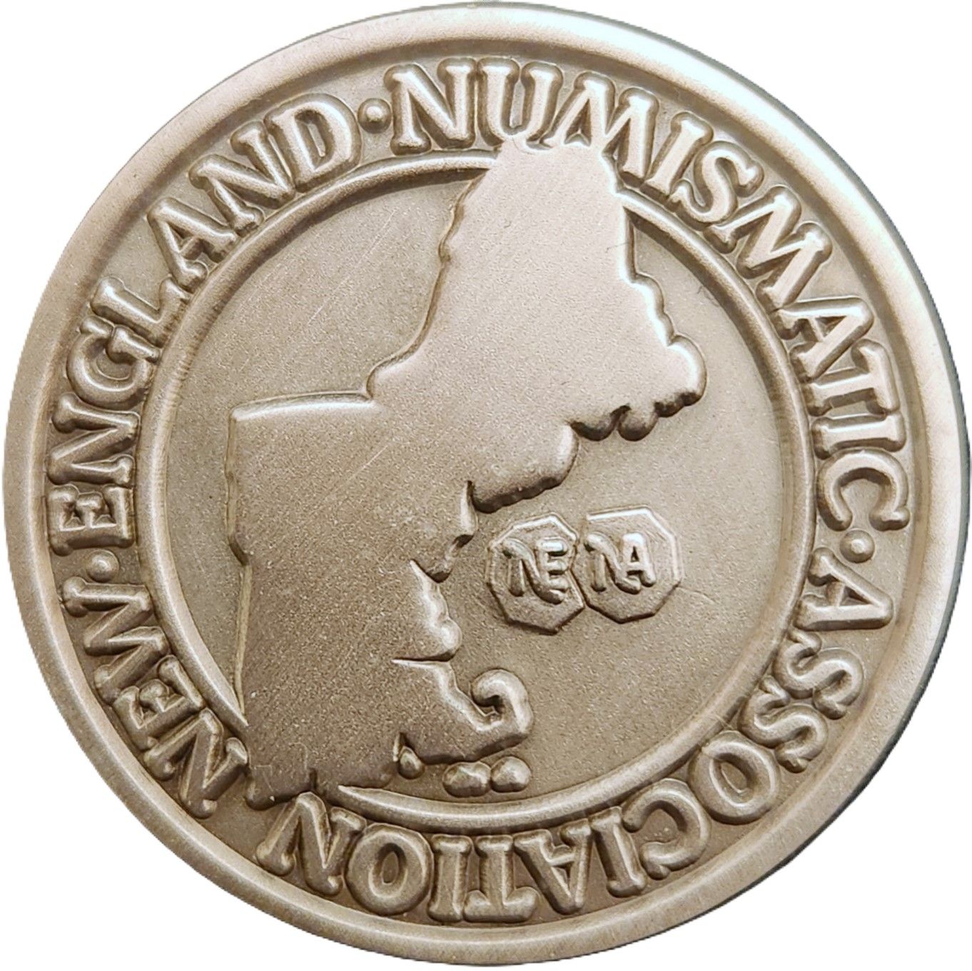 Описание: Логотип NENA, в центре которого изображена карта Новой Англии, а по краю — надпись NEW·ENGLAND·NUMISMATIC·ASSOCIATION.