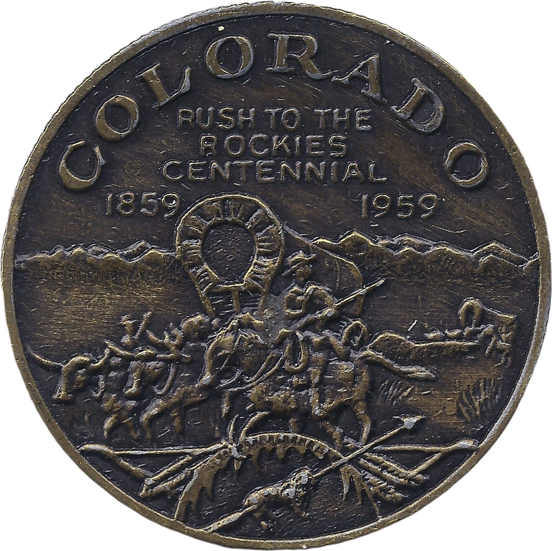 Описание: Напис над вершником на коні, воли тягнуть прерійний візок, гори на задньому плані. Дати з обох боків візка.