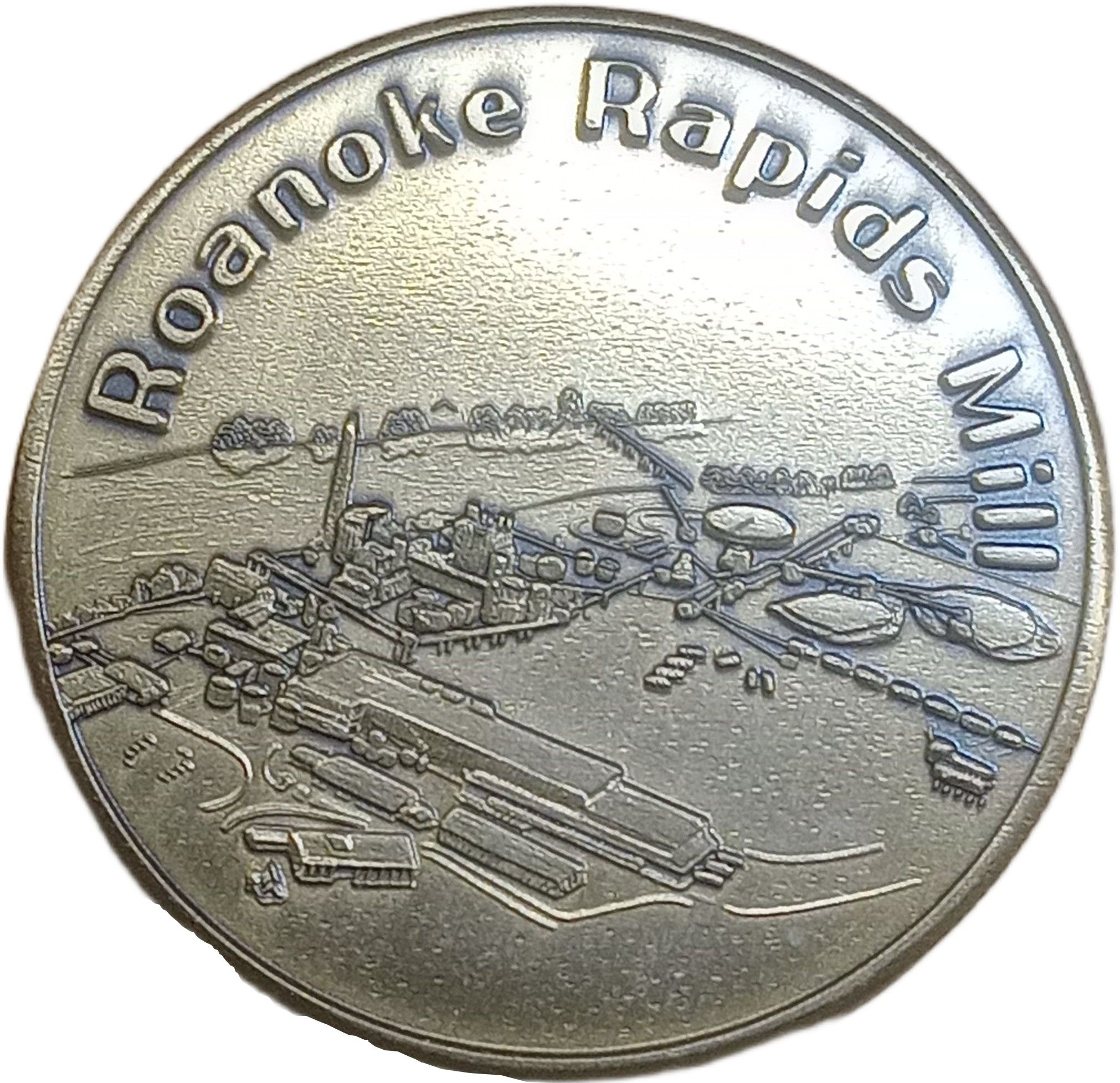 Описание: Детальний промисловий пейзаж, що зображує комплекс Roanoke Rapids Mill, включаючи будівлі, димарі та водойми. Дизайн вибитий у високому рельєфі, займаючи всю поверхню реверсу.