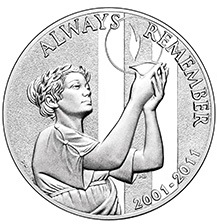 Описание: На монеті зображена Леді Свобода, яка тримає Лампу Пам'яті. За нею — промені світла, що тягнуться до неба. Свобода, лампа та світло символізують не лише незмірні втрати того дня, а й стійкість та перемогу тих, хто вистояв.