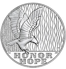 Описание: Зображує орла, що символізує силу тих, хто вижив, сімей та нації, на тлі водоспаду. Текуча вода є символом миру, спокою, зцілення та безперервності життя.