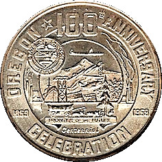 Описание: Сцена, що зображує продукти та галузі промисловості штату Орегон; у верхньому лівому куті — невеликий герб штату; під сценою — невеликий критий візок і упряжка, що рухаються вправо. Нижче на стрічці — «Фронтир майбутнього» / нижче стрічки — «Сторіччя» — все в центральному колі; зовні вгорі, навколо — «Орегон * 100-річчя»; ліворуч горизонтально — «1859», праворуч горизонтально — «1959»; внизу — «Святкування».