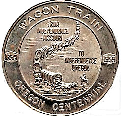 Описание: У центрі зображено критий вагон. Зверху: «From / Independence / Missouri» (Від / Індепенденс / Міссурі), праворуч: «To / Independence / Oregon» (До / Індепенденс / Орегон) — все в центральному колі; зовні зверху: «Wagons» (Вагони); ліворуч: горизонтально «1859»; праворуч: горизонтально «1959»; зовні знизу: «Oregon Centennial» (Сторіччя Орегону).
