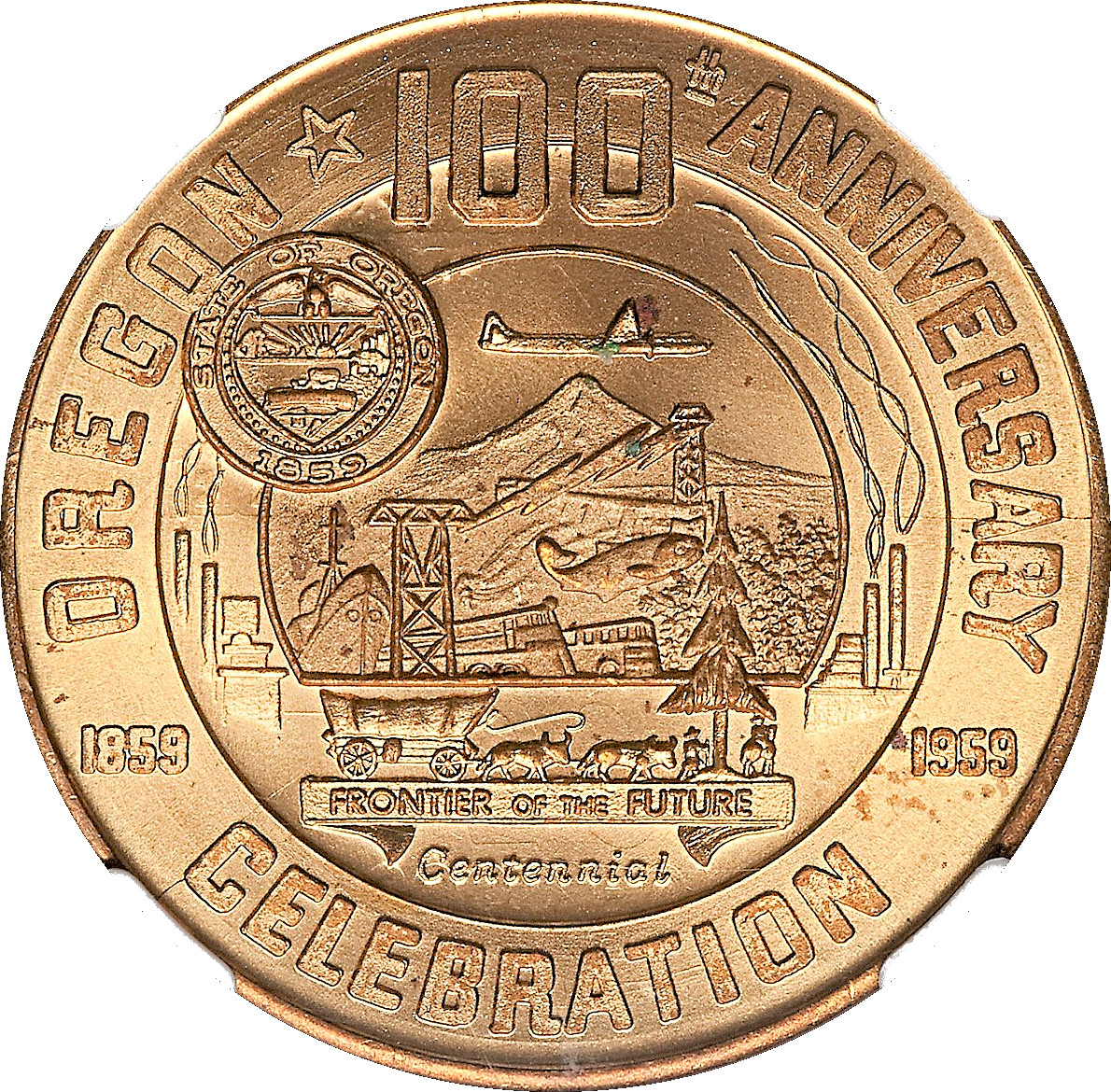 Описание: Сцена, що зображує продукти та галузі промисловості штату Орегон; у верхньому лівому куті — невеликий герб штату; під сценою — невеликий критий візок та упряжка, що рухаються вправо. Нижче на стрічці — «Фронтир майбутнього» / нижче стрічки — «Сторіччя» — все в центральному колі; зовні вгорі, навколо — «Орегон * 100-річчя»; ліворуч горизонтально — «1859», праворуч горизонтально — «1959»; внизу — «Святкування».