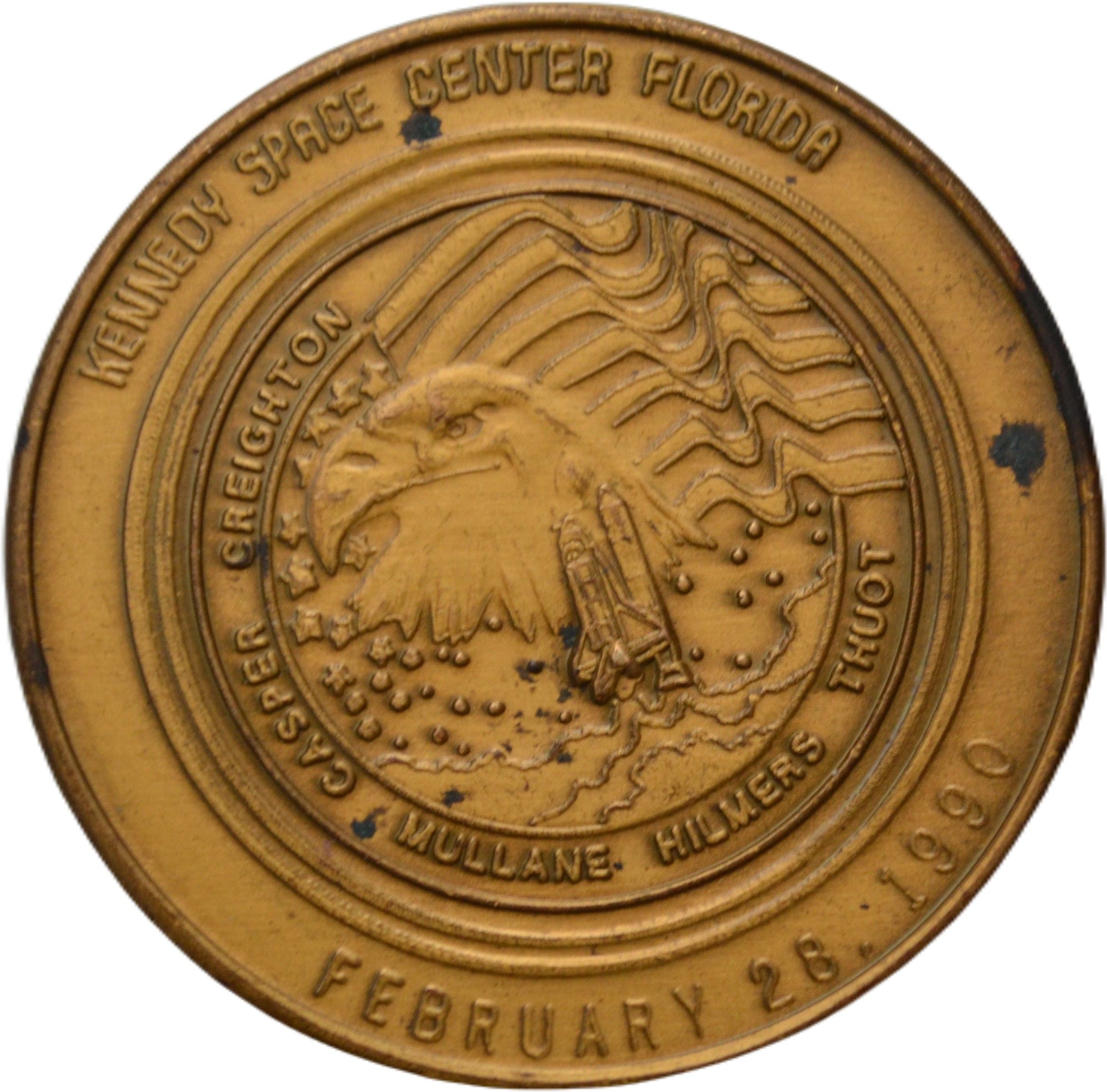 Описание: Емблема місії космічного човна STS-36 (голова орла, звернена вліво, над прапором Сполучених Штатів, з космічним човном внизу, оточена іменами астронавтів екіпажу човна).