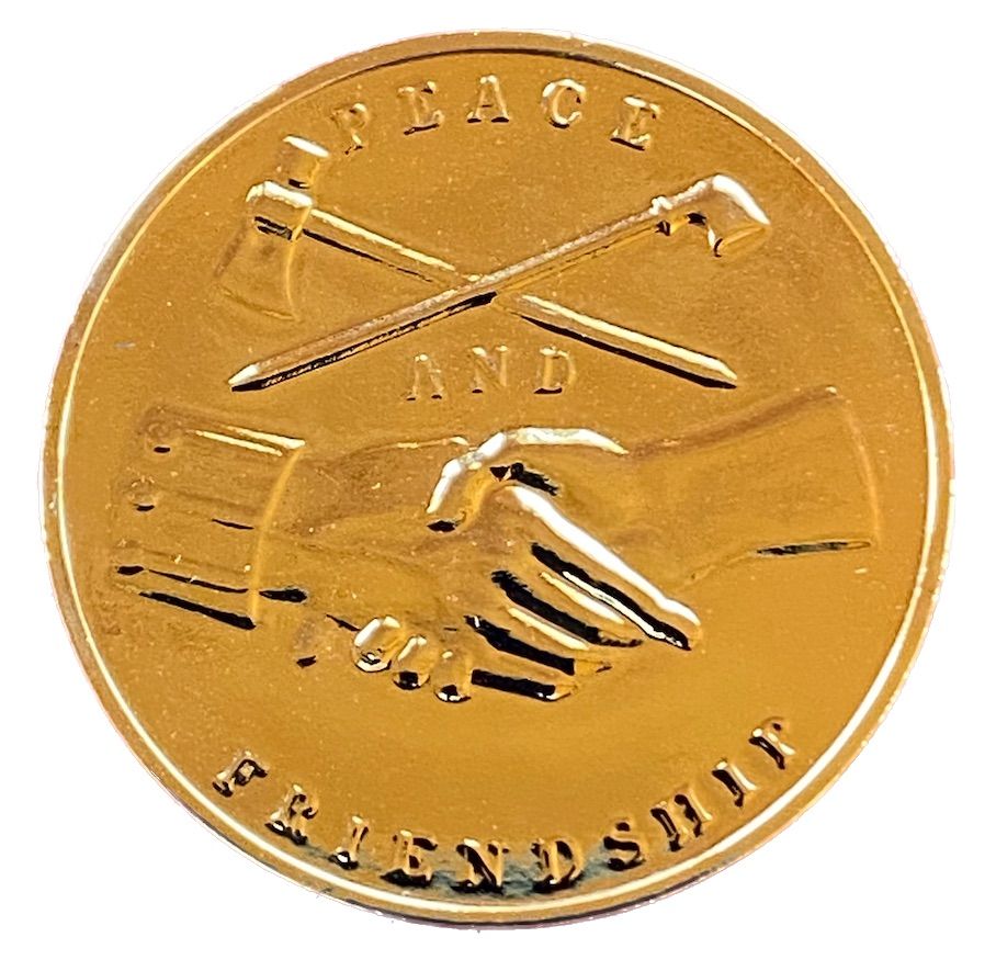 Описание: У верхній частині лицьової сторони зображено трубку миру та томагавк, що перетинаються. Дві руки стискаються в рукостисканні, ліва рука в манжеті з трьома ґудзиками, права — гола.