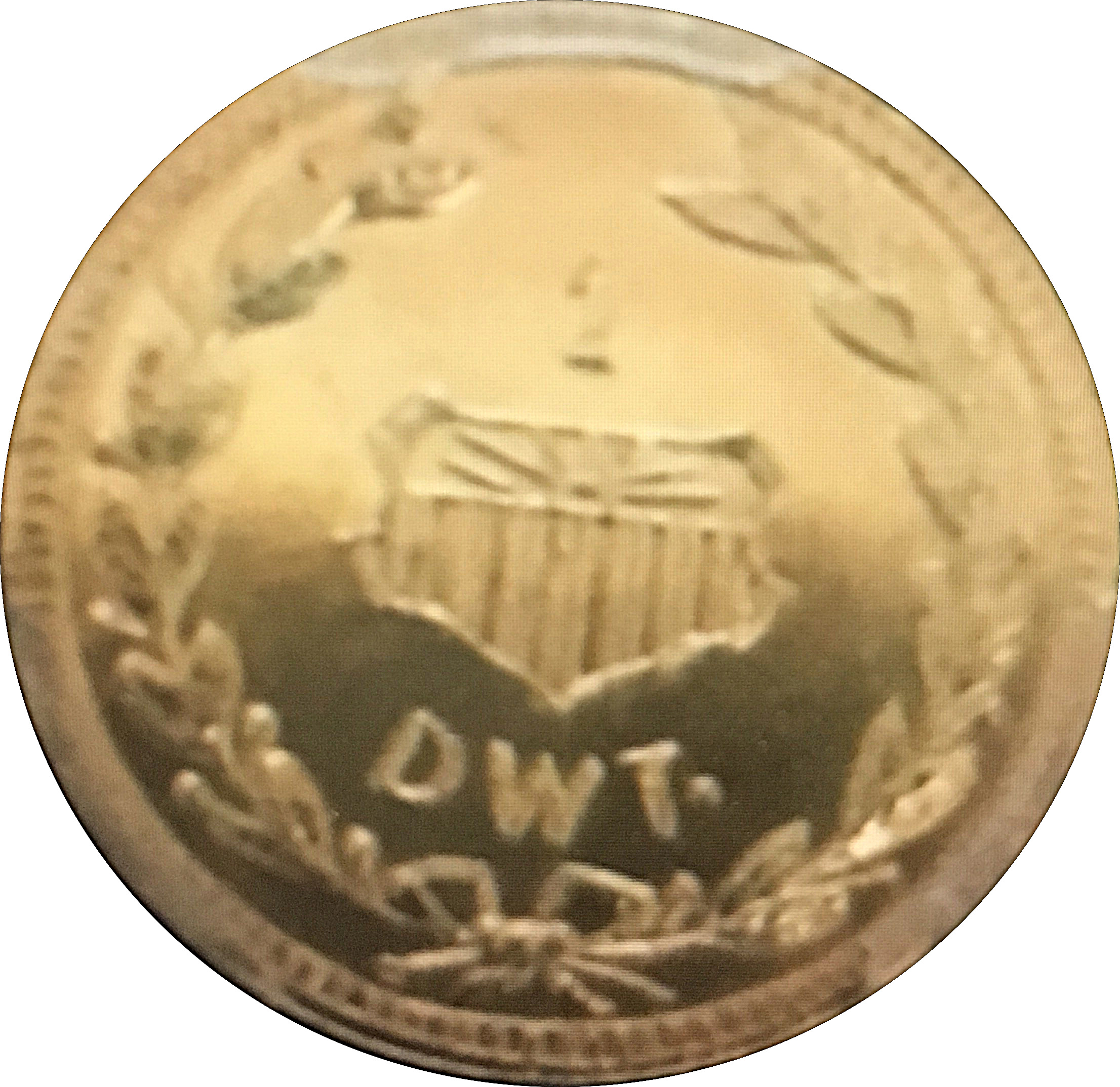 Описание: Усередині відкритого вінка знаходиться щит; над щитом — цифра 1; під щитом — DWT.; облямівка з намистинами.