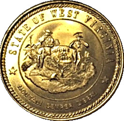 Описание: STATE OF WEST VIRGINIA (ШТАТ ЗАХІДНА ВІРДЖІНІЯ) уздовж верхнього краю. Державна печатка в центрі та девіз штату «MONTANI SEMPER LIBERI» (Гірські жителі завжди вільні) по центру уздовж нижнього краю.