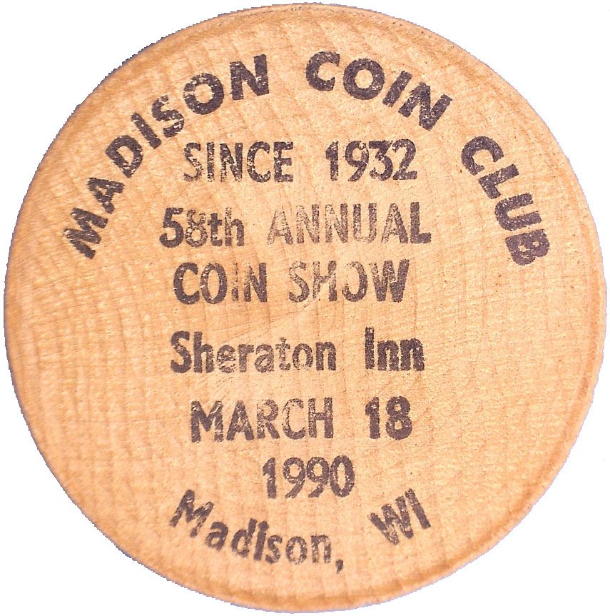 Название: Дерев'яна монета номіналом 5 центів — Madison Coin Club (Мэдисон, Вісконсін)