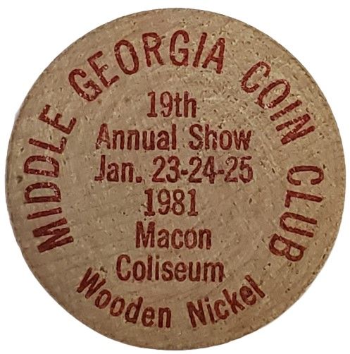 Дерев'яна монета номіналом 5 центів — Клуб колекціонерів монет Середньої Джорджії — 19-та щорічна виставка (Макон, Джорджія)