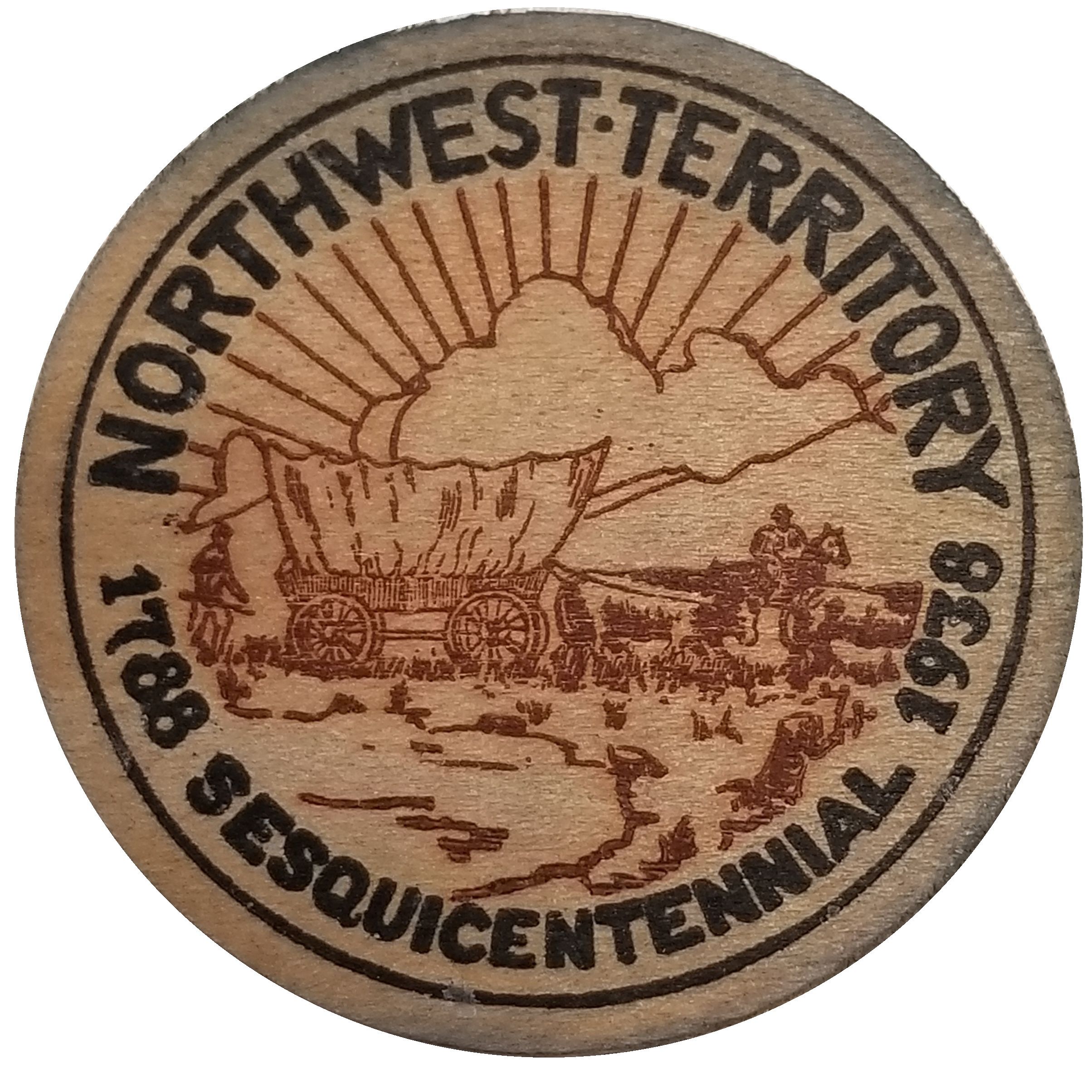 Описание: Критий візок, запряжений парою волів, гора з хмарами та променями на тлі. NORTHWEST · TERRITORY (Північний Захід · Територія) навколо верхнього краю, 1788 SESQUICENTENNIAL 1938 (1788 150-річчя 1938) навколо нижнього краю. Текст і віньєтка в оточенні кола. Віньєтка коричневою фарбою, текст і коло чорною фарбою.