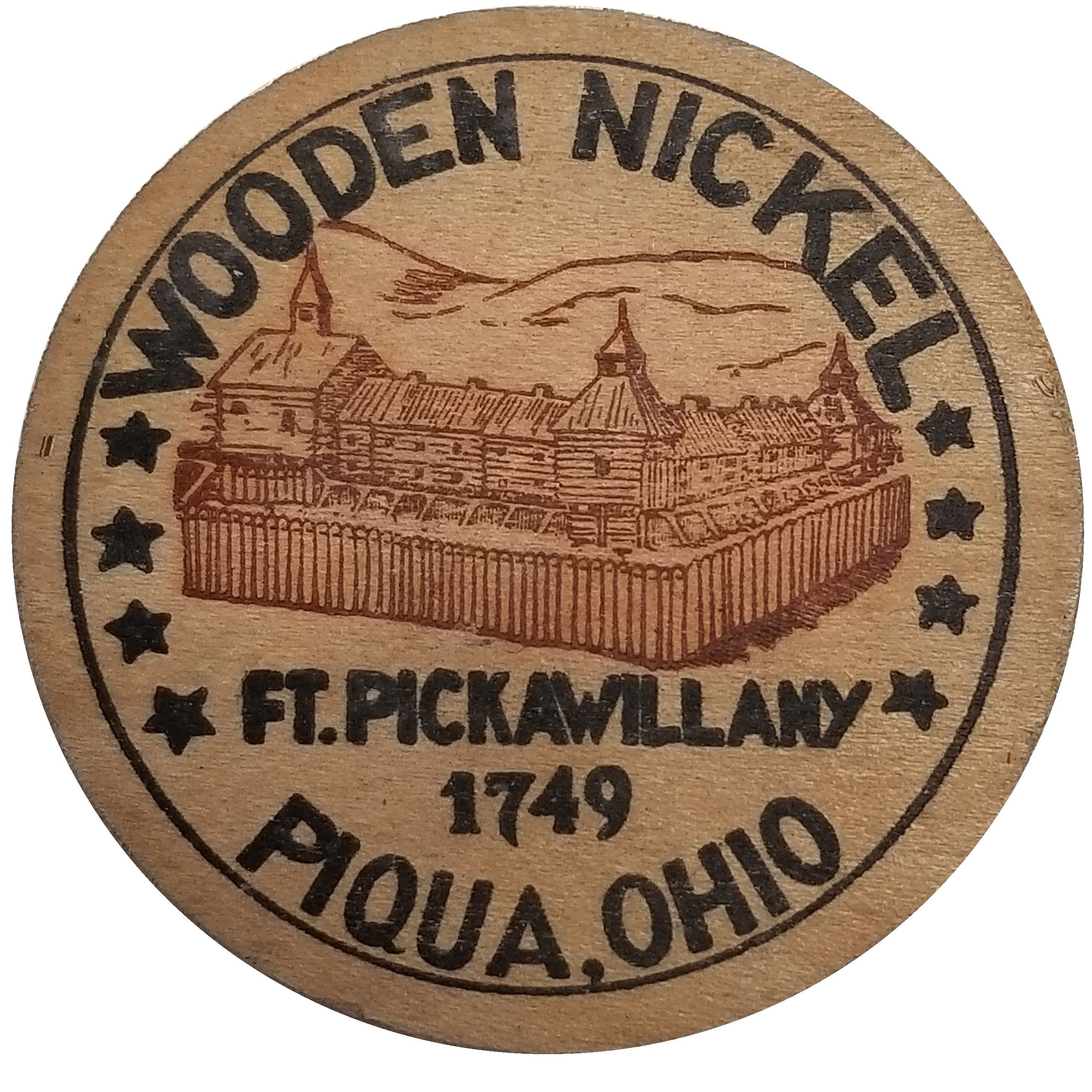 Описание: Зображення форту Пікавіллані в центрі, FT. PICKAWILLANY / 1749 під фортом, ****WOODEN NICKEL**** / PIQUA, OHIO по краю, все в оточенні кола. Форт коричневою фарбою, текст і коло чорною фарбою.