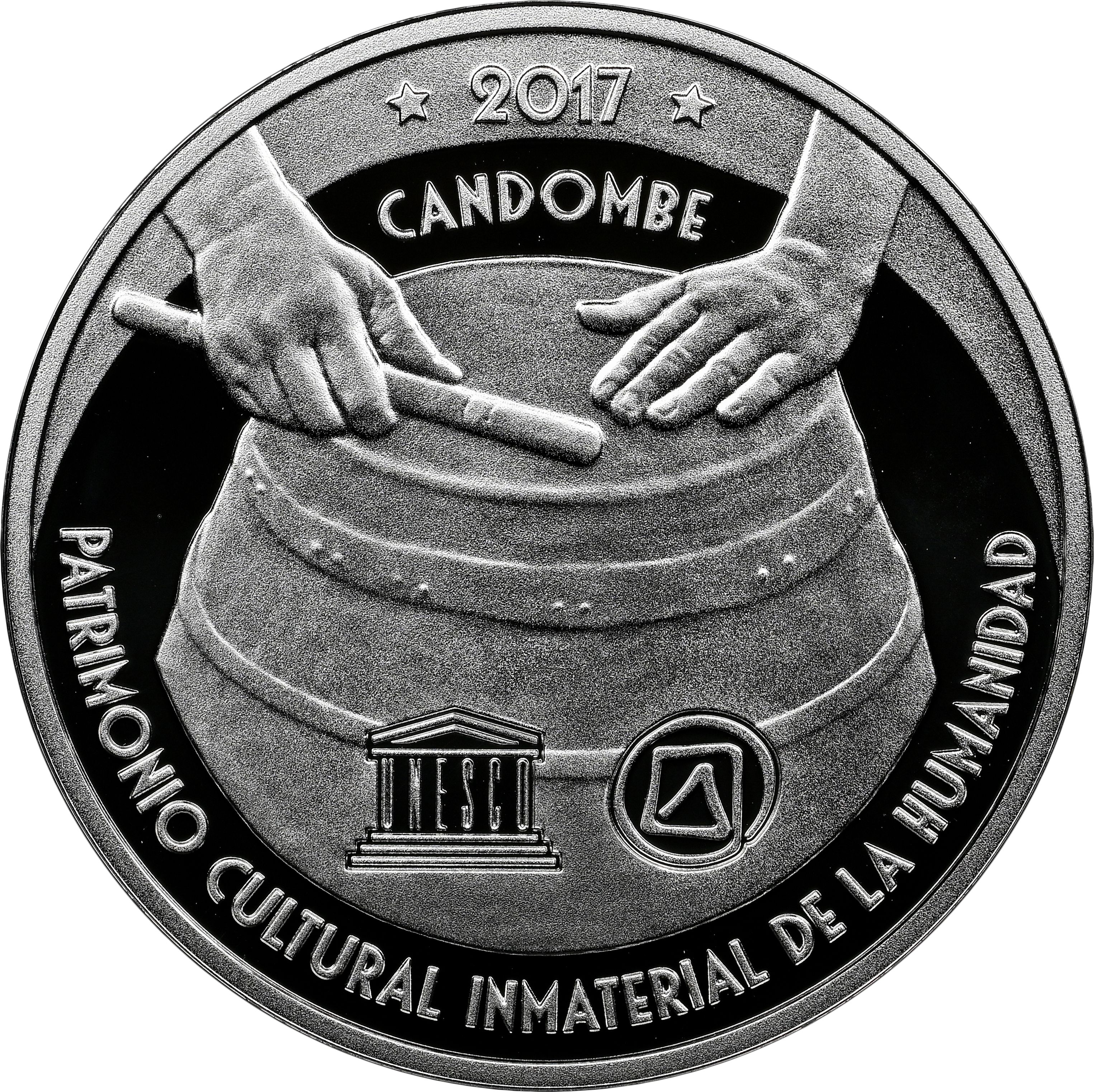 Описание: Изображение рук, играющих на барабане кандомбе, логотипы ЮНЕСКО и НКН, изогнутая надпись внизу, дата между пятиконечными звездами вверху, над названием мероприятия.